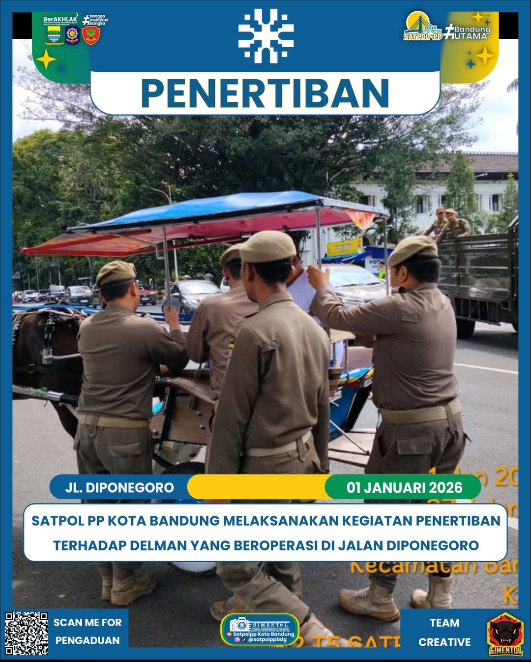 Satpol PP Kota Bandung melaksanakan kegiatan penertiban terhadap delman yang beroperasi di Jalan Diponegoro, tepatnya di depan Gedung Sate. Kegiatan ini dilakukan sebagai upaya menjaga ketertiban umum, kelancaran arus lalu lintas, serta kenyamanan masy